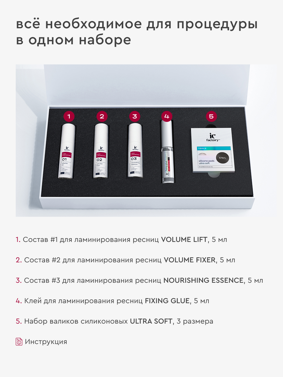 | Подробная комплектация | Состав #1 для ламинирования ресниц VOLUME LIFT IC FACTORY, 5 мл — 1 шт.; Инструкция — 1 шт. |