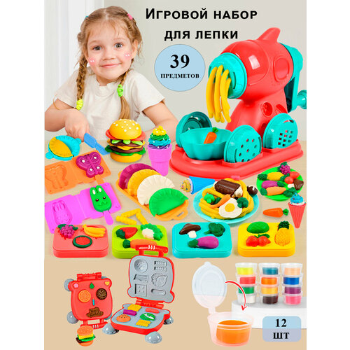 Набор для лепки и творчества включает в себя 39 предметов, включая 12 герметичных контейнеров глины, машинку для лапши и гамбургеров. Все элементы изготовлены из безопасных материалов, таких как пшеница, вода и пигмент, что делает их абсолютно безопасными для детей от 3 лет.
