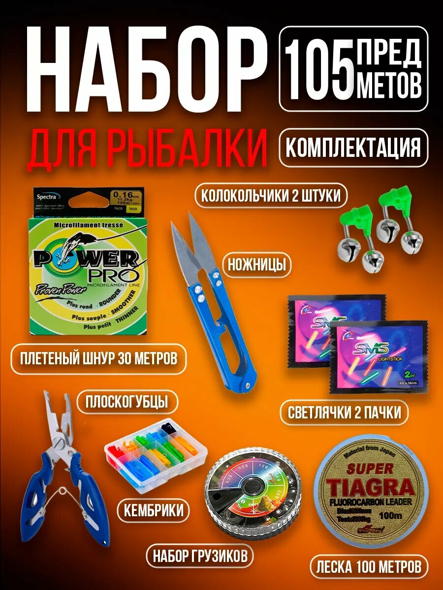 В состав подарочного набора мужчине для рыбалки входят крючки карповые, сигнализаторы клёва колокольчики, стопорки-рыболовные для лески, светлячки для ночной рыбалки, ножницы для лески, плоскогубцы крючковязы, экстрактор для крючков, набор грузил рыболовных, а также леска флюрокарбоновая и плетеный шнур, поплавки разных грамм (от 3 до 6 грамм) и кембрики на леску. Подарочный набор для рыбалки представлен в практичной ящике, с которым станет комфортнее хранить и брать с собой на рыбалку приманки и снасти.