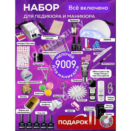 Вы сможете сделать маникюр полностью благодаря этому набору! Набор для аппаратного маникюра и педикюра Nails Box – это отличный выбор, если Вы делаете маникюр дома, самостоятельный маникюр или Вы начинающий мастер маникюра. И профессиональный мастер тоже оценит эти предметы для маникюра! Набор для маникюра с лампой. UF / LED лампа для ногтей подходит для всех видов покрытия. Мощная лампа для маникюра бережно высушит гель-лак на ногтях и поможет сделать наращивание ногтей. Аппарат для маникюра и педикюра mercedes, в комплекте насадки для аппаратного маникюра. Алмазные насадки и шлифовальные насадки обеспечат Вам ухоженные руки. В комплект также входит набор фрез. Аппарат для маникюра профессиональный. Аппарат с плавным переходом и реверсом - обратное вращение фрезы. Низкий уровень шума и отсутствие вибрации при выполнении работ. Маникюрный и педикюрный аппарат подходит для базовой чистки ногтевой арки, обработки кутикулы, снятия лака, шлифовки, полировки, коррекции и наращивания ногтей, моделирования любой формы. Это средство для очищения кутикулы и с ним также доступна шлифовка ногтевой пластины. Качественный аппарат для профессионального и начинающего мастера, включая маникюр в домашних условиях, маникюр самой себе. Щеточки для маникюра позволят работать без пыли, получить чистый маникюр. В подарок масло для кутикулы, для бархатной кожи рук. Чтобы сделать обрезной маникюр у Вас будут кусачки / щипчики для ногтей качественные, а также маникюрные ножницы. Для самостоятельного маникюра Вам также понадобятся апельсиновые палочки для кутикулы, бафы для полировки ногтей, чтобы у Вас были гладкие блестящие ногти. Набор лаков для ногтей. Набор гель-лаков разных цветов. Лак антиаллергенный, подходит для чувствительной кожи, обеспечивает легкое нанесение, плотный насыщенный цвет, не полосит. Удобная кисточка. В комплект входят разделители для пальцев. У Вас также будет палитра для гель-лаков / типсы для гель-лака. Вы получаете все для наращивания ногтей. Гель для наращивания ногтей . Вы легко сможете самостоятельно нарастить себе ногти, сделать длинные ногти. Гель однофазный, выравнивающийся. Также есть полигель для наращивания, для ремонта трещин ногтей, для выравнивания ногтевой пластины. Вы получаете кисть для наращивания ногтей и шпатель для наращивания ногтей акригелем, формы для наращивания ногтей. Для подготовки ногтей Вы получите праймер для маникюра. Он работает как обезжириватель для маникюра. Это кислотный праймер без липкого слоя. И безворсовые салфетки, чтобы у Вас был идеальный маникюр. База - основа для создания маникюра. Выравнивает, не вызывает раздражения, подходит для тонких ногтей и слабых ногтей. Антиаллергенная база для маникюра. Для снятия маникюра в комплекте специальная жидкость, именно средство для снятия гель-лака с провитамином B5 и дополнительно жидкость для обезжиривания ногтей и снятия липкого слоя с витамином Е. Для дизайна ногтей Вы получите стразы цветные. Серебристая лента для современного стильного дизайна. Цветные блестки для маникюра. Золотая поталь для дизайна. Гель-паутинка для дизайна ногтей белого цвета. Набор наклеек – наклейки для ногтей, для маникюра и для педикюра. Набор кистей. Кисточки для рисования на ногтях и чтобы сделать покрытие под кутикулу. Кисти разной формы, разного размера, дл