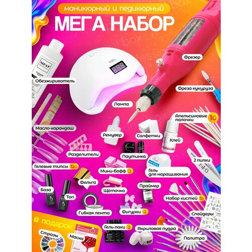 В комплект входит: Лампа для маникюра 48Вт, Аппарат для маникюра, фрезы кукуруза, гель-лак - 5шт, праймер - 1шт, база - 1шт, топ - 1шт, гель для наращивания ногтей - 3шт, полигель - 1шт, кисть для полигеля, паутинка для дизайна, пилки для ногтей, безворсовые салфетки, формы для наращивания - 10шт, набор кистей для дизайна - 15шт, жидкость для снятия лака, обезжириватель, блестки - 2шт, поталь - 2шт, палитра - 1шт, наклейки для ногтей - 1шт, мини-щетка - 1шт, мини-баф - 3шт, Фреза пламя-шар, разделители для пальцев, апельсиновые палочки - 10 шт. + 2 подарка внутри: 1)Набор страз разных цветов 2)Тканевая маска для лица + 3D стикеры!