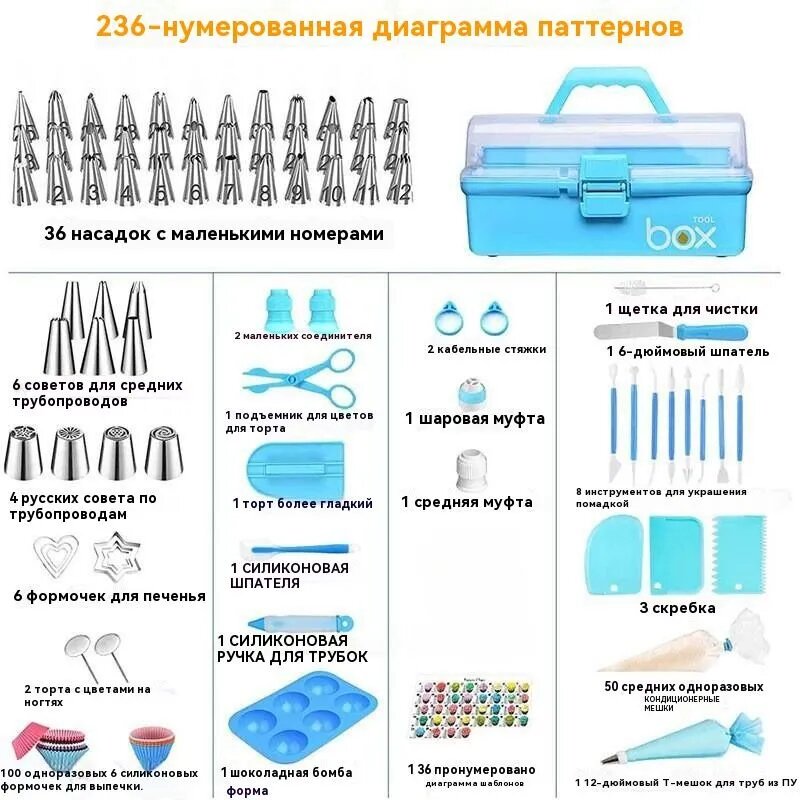 Большой кондитерский набор из 236 предметов для моделирования декорирования кондитерских изделий. Он подойдет как для новичков так и для опытных кондитеров. Необходим для украшений тортов, кексов, печенья, выпечки и других десертов. Аксессуары помогают легко изготовить кондитерское изделие. Для декорирования десертов имеются все необходимы специальные кондитерские инструменты. Помогают украсить торты и капкейки на дни рождения, свадьбы и другие мероприятия. После оформления кондитерского изделия все инструменты складываются в удобный контейнер. Лучший подарочный набор для женщины, мужчины, ребенка и любого, кто хочет приготовить красивый торт!