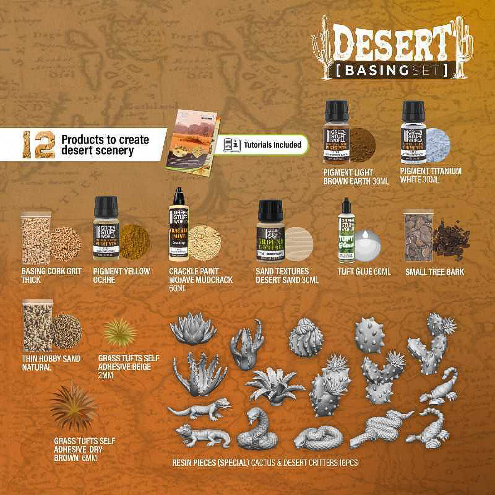В этот набор входят различные декоративные элементы для оформления подставок, напоминающих пустынные пески и негостеприимную среду. Вы сможете воспроизвести типичные эффекты пыли в пустыне, трещины и дюны. Эти материалы для моделирования и варгейминга идеально подойдут как для начинающих, так и для любителей, и помогут воплотить ваши замыслы в жизнь.