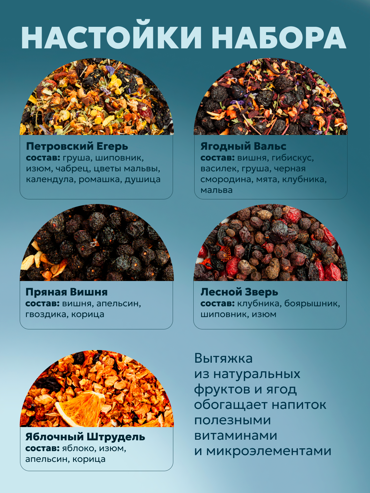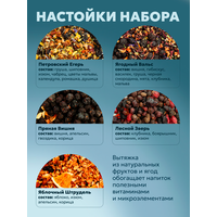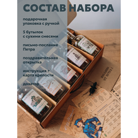 Состав набора: Включает в себя 5 бутылок объёмом 0.5 литра, Фильтр-пакеты, Спиртометр, Инструкция по приготовлению, Карта крепости, Поздравительная открытка.