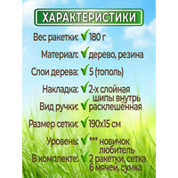 Вес набора: 840 г Вес 1-й ракетки: 180 г Габариты в упаковке: 29х18х8 Накладка: 2-х слойная, шипами внутрь Толщина губки: 2 мм Кол-во слоёв дерева: 5 (тополь) Вид ручки: Расклешенная (FL) Уровень: *** любитель/новичок Материал ракеток: Дерево, резина Высота/длина сетки: 15 / до 190 см Комплектность: Ракетки - 2 шт, сетка, чехол, мячи - 6 шт