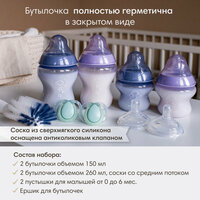 В состав набора входят две бутылочки объемом 150 мл и 260 мл, две соски со средним потоком и две пустышки для малышей от 0 до 6 месяцев.