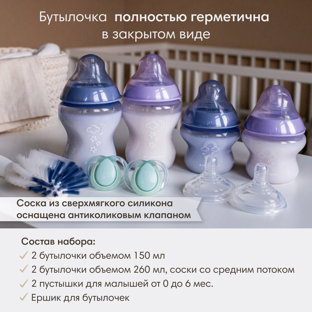 2 бутылочки объемом 150 мл, 2 бутылочки объемом 260 мл, 2 соски со средним потоком, две пустышки для малышей от 0 до 6 мес., ершик для бутылочек
