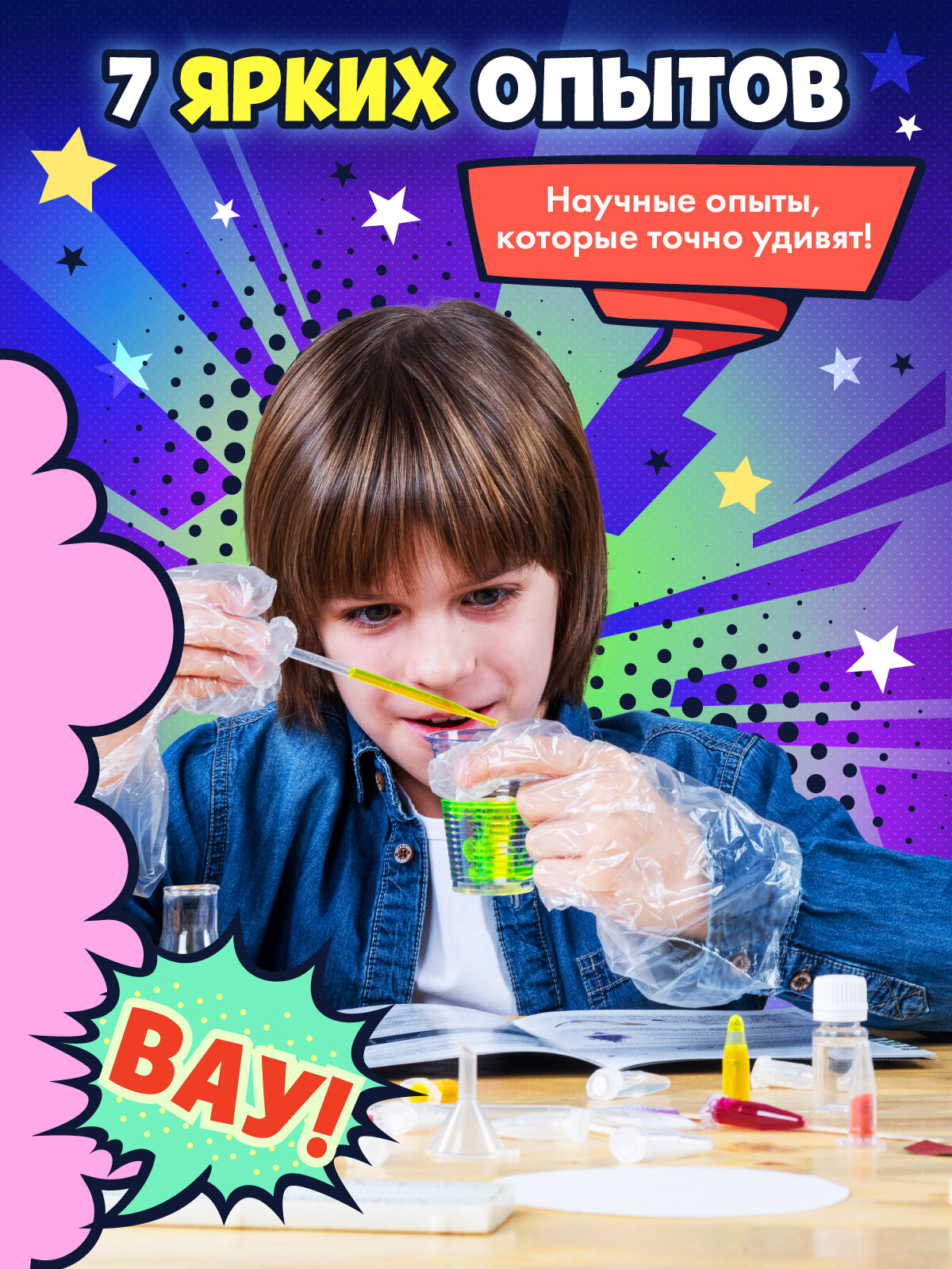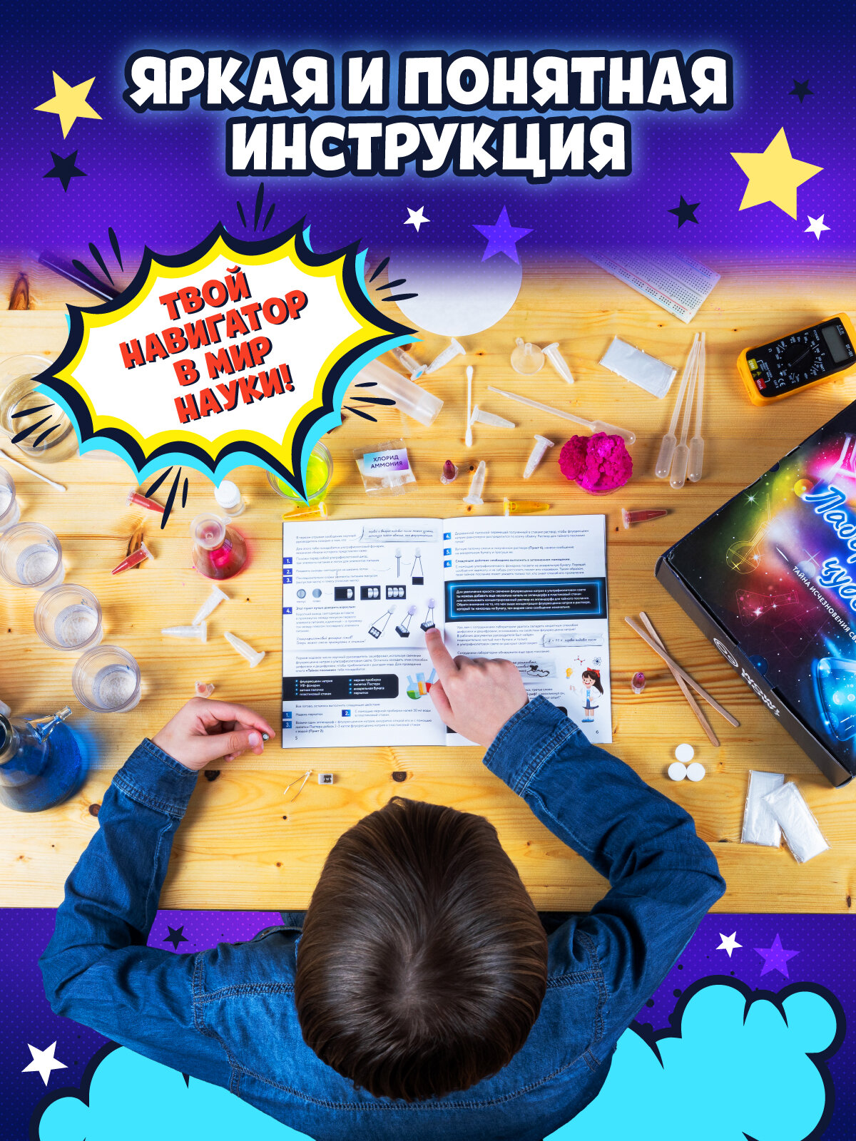 В наборе есть все для создания нужного эффекта: все необходимые реактивы и научный инструментарий.