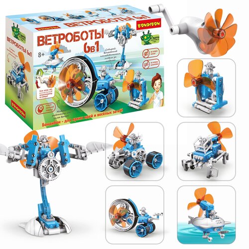 Ветер, ветер, ты могуч! Ветроботы от Bondibon тоже не отстают. Ведь ветер - их главных помощник. Ветроботам не нужны ветряные турбины, они будут ходить, двигаться, плавать от обычного ветерка. И даже, если безветренная погода – не беда! В наборе робототехники идет ручной ветрогенератор – пропеллер вертушка. Почувствуйте себя повелителем ветра и легко приводите в движение своих трансформер и дома, и на улице. Но это потом. Сначала соберите нужную модель. На выбор 6 потрясающих модулей, которые будет интересно изучать. Трицикл или ветряная яхта, крылатая машина или бур-машина, четвероногая машина или робот. В комплекте детали конструктора для строительства ветроботов и подробная иллюстрированная инструкция по сборке. Дополнительно вам понадобятся (не входят в набор): плоскогубцы, отвертка, молоток, бумажные полотенца, стакан, ватная палочка. И никаких батареек.