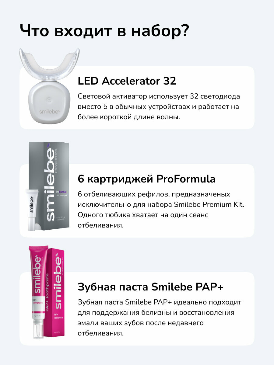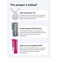 Smilebe Premium Kit - это набор для профессионального отбеливания зубной эмали, который сочетает передовую технологию Led Acceleration 32 с эффективным отбеливающим гелем ProFormula. Набор обеспечивает профессиональный уровень отбеливания зубов в домашних условиях за короткий промежуток времени - всего за 16 минут в день. Бонусом в наборе идет PAP+ зубная паста, которая улучшает результаты отбеливания. В комплекте Smilebe Premium Kit входит 6 рефилов на каждый день.