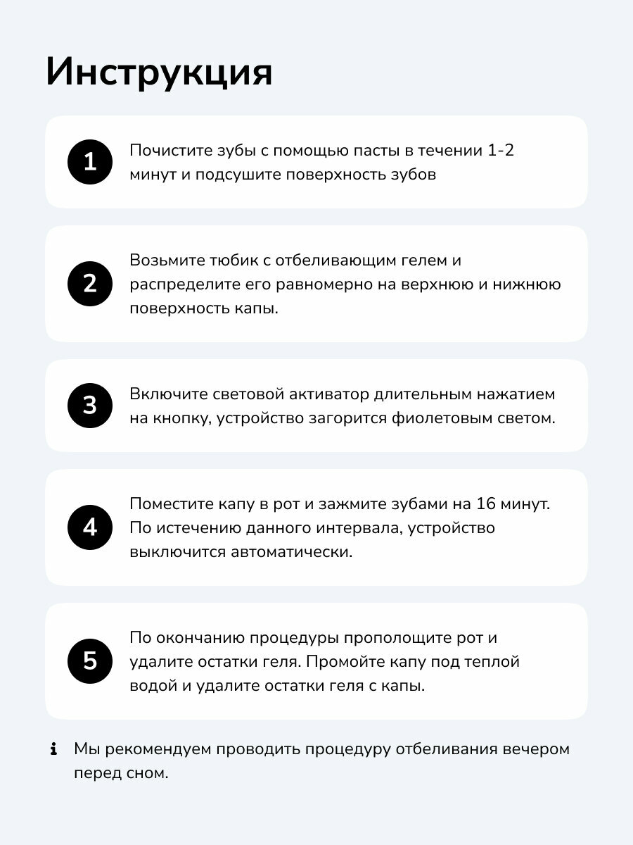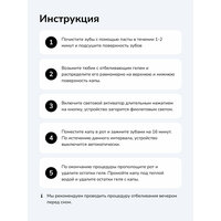 1. Почистите зубы с помощью пасты в течение 1-2 минут и подсушите поверхность зубов. 2. Возьмите тюбик с отбеливающим гелем и распределите его равномерно на верхнюю и нижнюю поверхности каппы. 3. Включите световой активатор длительным нажатием на кнопку, устройство загорится фиолетовым светом. 4. Поместите каппу в рот и зажмите зубами на 16 минут. По истечении данного интервала, устройство выключится автоматически. 5. По окончанию процедуры прополощите рот и удалите остатки геля. Промойте каппу под теплой водой и удалите остатки геля с каппы.