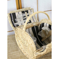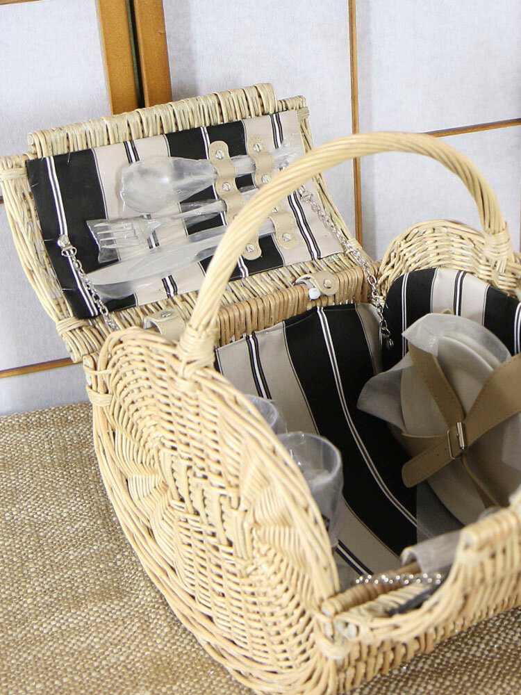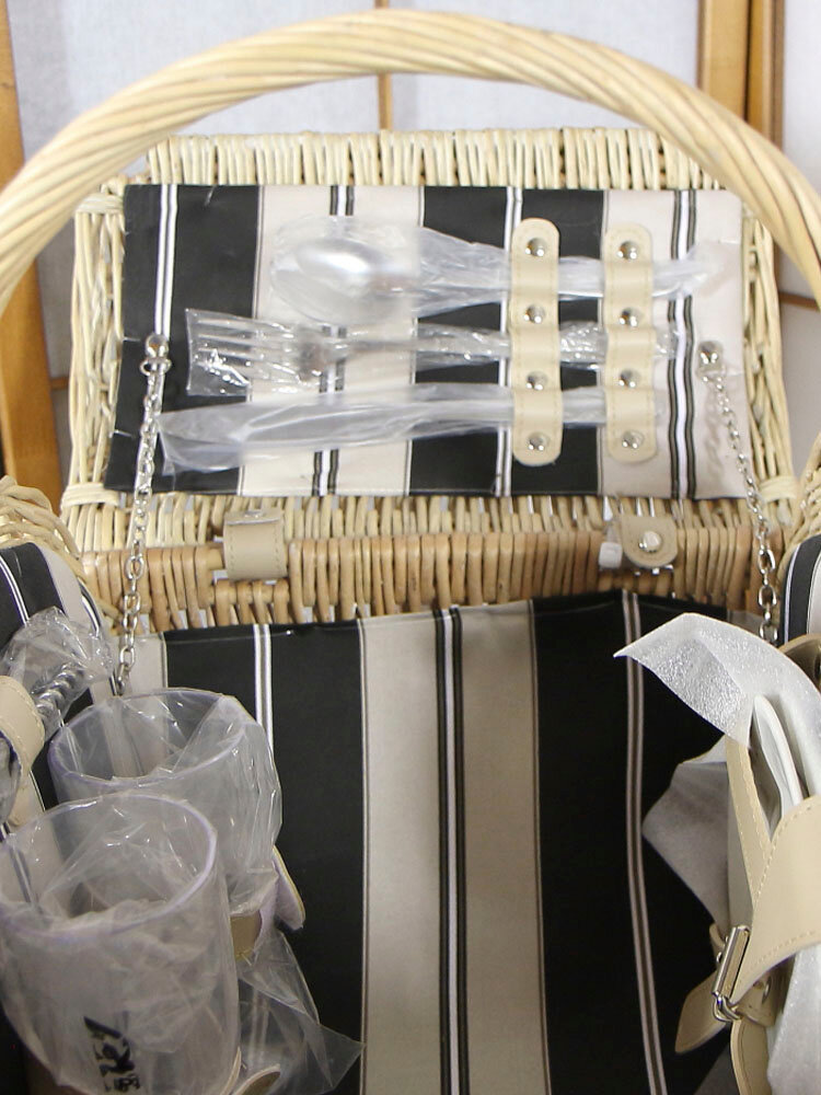 Комплектация: 1 - корзина для пикника; 2 - белые керамические тарелки по 18 см; 2 - бокала из ЭКО-пластика; 2 - ножа (21 см.) из нержавеющей стали; 2 - вилки (19 см.) из нержавеющей стали; 2 - чайные ложки (16 см.)из нержавеющей стали; 1 - штопор (3 в 1) из нержавеющей стали
