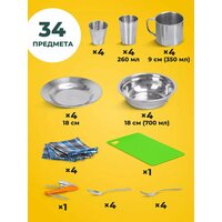 Набор для пикника на 4 персоны Helios - это идеальное решение для беззаботного пикника на открытом воздухе. Походный набор посуды Гелиос включает в себя все необходимое для приятного времяпрепровождения с друзьями или семьей. Все предметы надежно зафиксированы в прочной компактной и вместительной сумке для пикника (30*13*32 см), изготовленной из влагостойкого материала. Сумка оснащена удобными ручками и плечевым ремнем для переноски. Посуда дорожном наборе для кемпинга изготовлена из пищевого металла и пластика - они абсолютно безвредны для здоровья и долговечны. Набор посуды для пикника на 2 персоны сочетает в себе функциональность, стильный дизайн и высокое качество материалов. Он идеально подходит для пикников, поездок на пляж, кемпинга, рыбалки, выходных на даче: с ним вы можете наслаждаться вкусной едой и напитками в уютной атмосфере. Этот походный набор станет отличным подарком на день рождения или Новый год для папы, мужа, брата, дедушки, друзей и коллег. В подарочный набор для пикника входит: • сумка • открывашка • доска разделочная • 4 тарелки (диаметр 18см) • 4 миски глубоких (диаметр 18см) • 4 кружки 260 мл • 4 стакана 175 мл • 4 стопки • 4 ложки • 4 вилки • 4 стопки • 4 салфетки из хлопка