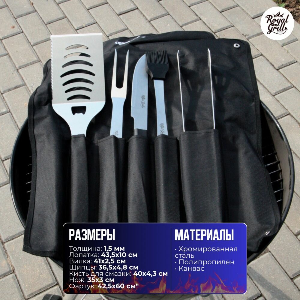 Набор для гриля и барбекю Royal Grill представляет собой комплект инструментов, необходимых каждому профессионалу и любителю барбекю. В него входят вилка, лопатка, щипцы, кисть, нож и фартук, выполненные из хромированной стали.