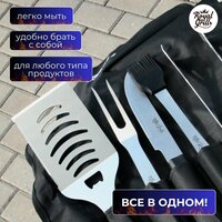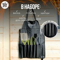 Вилка используется для перемещения больших кусков мяса на гриле, а лопатка помогает переносить продукты на гриле или барбекю, снимать пищу с гриля и убирать золу. Щипцы необходимы для безопасного переворачивания и перемещения продуктов на гриле или барбекю. Кисть подходит для нанесения масла, соусов или маринадов на продукты перед приготовлением. Нож для гриля используется для нарезки мяса на гриле, а фартук служит защитой для одежды, надетой под него.