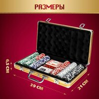 В комплект входит: 300 фишек без номинала, две колоды карт, фишку Dealer, игровой кубик и кейс для хранения.