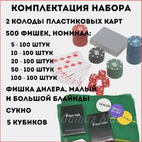 Покер. Покерный набор. Набор для покера. Обратите внимание вес одной фишек 4 грамма. В комплект набора входит сукно и пластиковые карты. Набор для покера в кейсе порадует игроков, как своим качеством, так и доступной ценой. Он прекрасно подойдет для игры в дороге или на отдыхе. Фишки лежат в стильном серебристом алюминиевом кейсе, благодаря чему набор можно переносить и брать с собой. Наборы содержат две колоды карт, каждая из которых включает 54 карты, выполненные из пластика и содержат яркое износостойкое изображение. Набор покера поставляется в красивой упаковке благодаря чему он является оригинальным подарком на День рождения, юбилей, на Новый год и 23 февраля. Покер; фишки для покера; набор для покера; покер набор; набор покера; набор для покера в кейсе; набор для покера 500 фишек; набор покер; набор для игры в покер; покер фишки; набор фишек для покера; набор для покера 300 фишек; фишки для покера с номиналом; Комплектация: Набор 500 фишек по 4 грамма в серебристом алюминиевом кейсе, номиналы 5 - 100 шт, 10 - 100 шт, 20 - 100 шт, 50 - 100 шт, 100 - 100 шт, сукно, 2 колоды пластиковых карт, «кнопка» дилера, большой и маленький блейды, 5 кубиков.