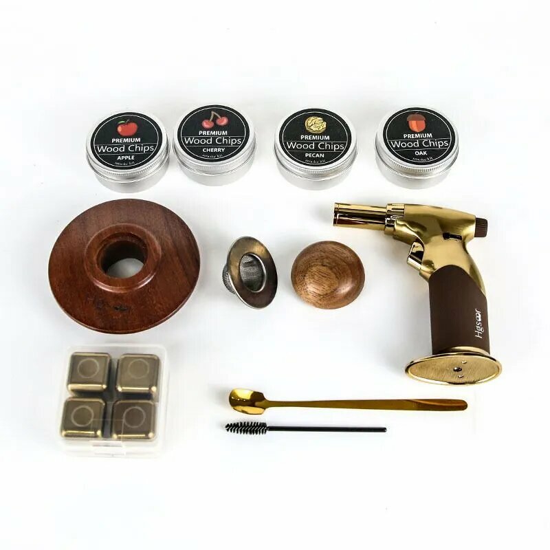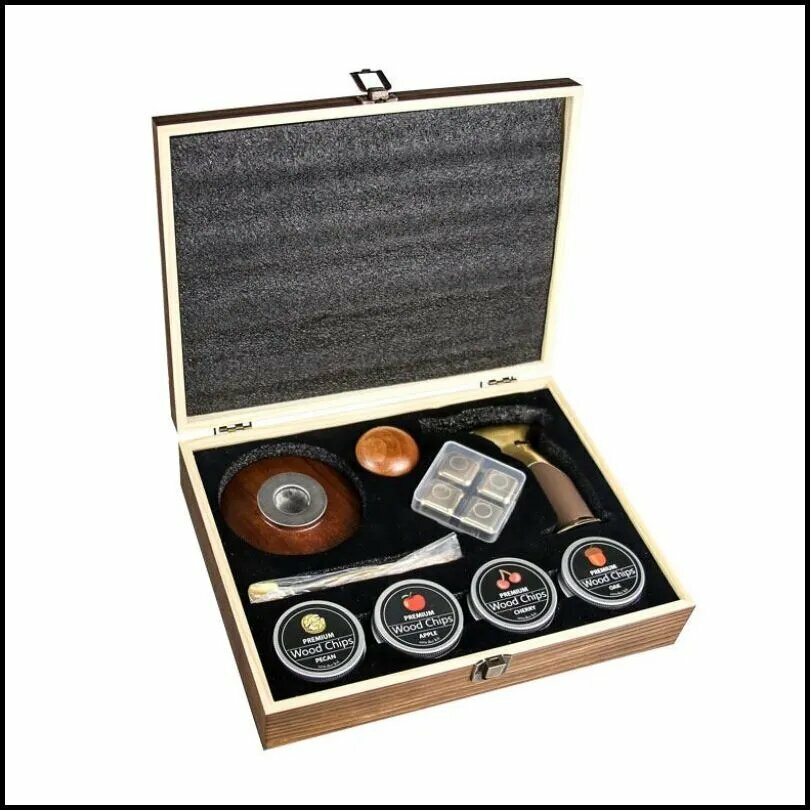 Набор включает в себя анатомическую горелку, которая позволяет поджигать натуральную древесную щепу яблока, грецкого ореха, вишни или дуба над устройством для курения коктейлей (смокером). Это создает каскад белого дыма, который водопадом изольется на ваши напитки или еду, наполняя их привлекательным древесным ароматом и величественной атмосферой.