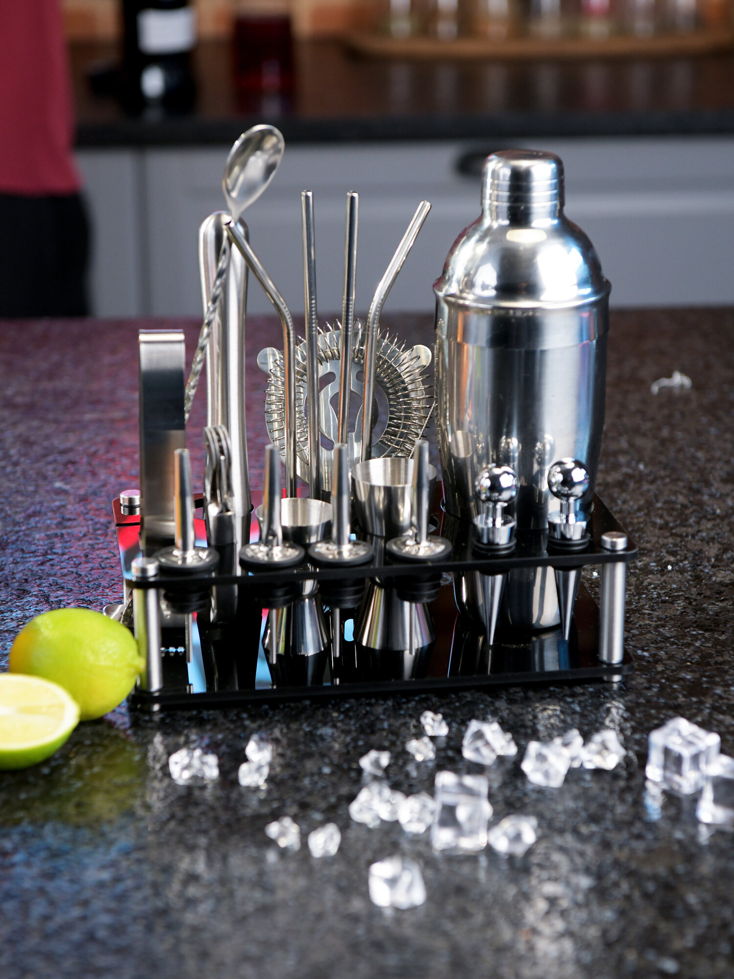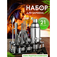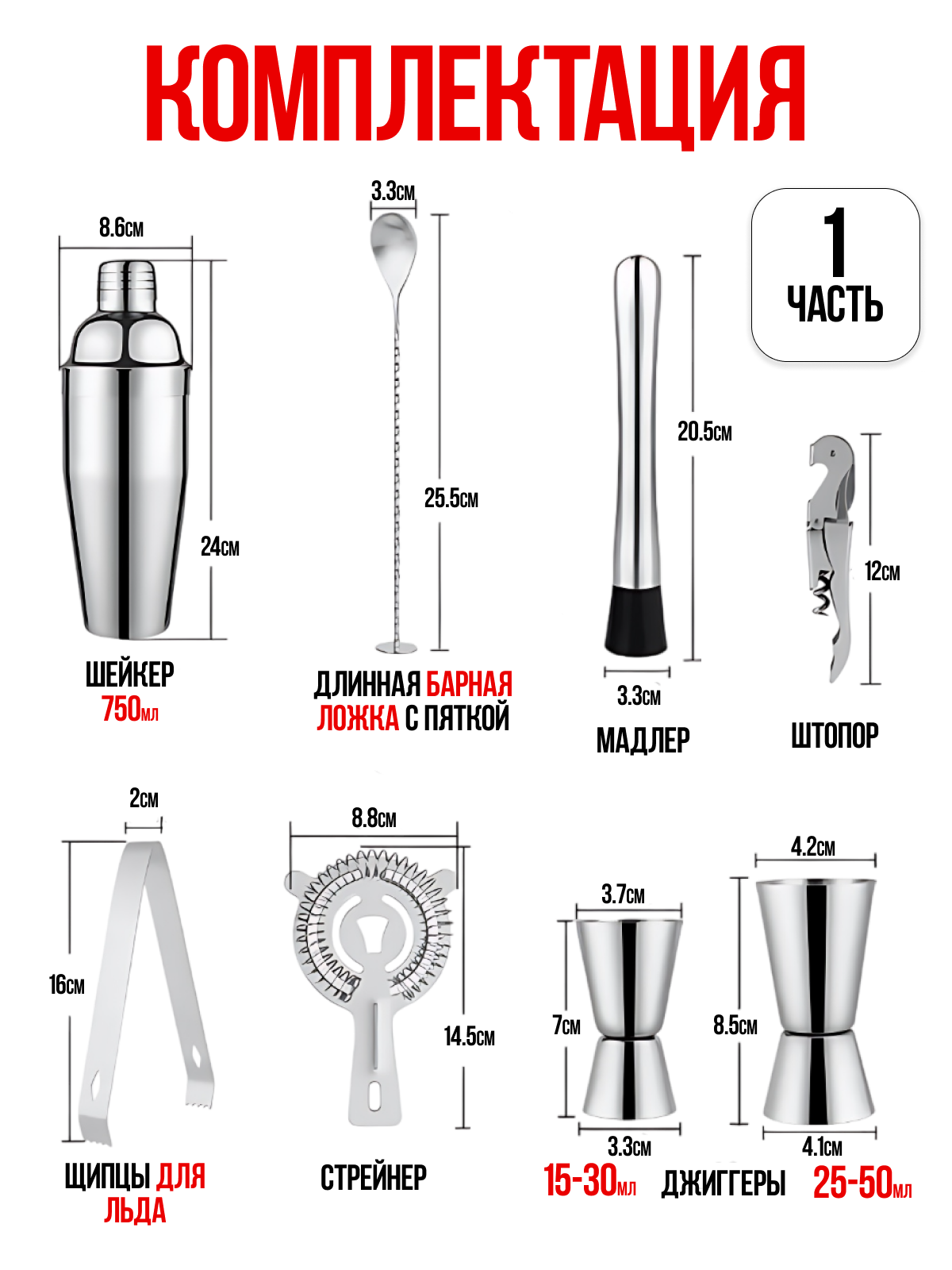 В комплекте вы найдете 20 предметов, включая классический барменский шейкер объемом 750 мл, джиггеры 15/30 и 25/50 мл, гейзеры, мадлер, стрейнер, штопор, барменскую ложку с пяткой, щипцы для льда, пробки для бутылок, стальные трубочки и подставку.