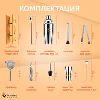 Набор бармена для приготовления коктейлей из 14 предметов: Шейкер коблер 750 мл — смешивает и охлаждает. Джиггер 15/30 мл — отмеряет количество жидкости, сохраняет правильную пропорцию ингредиентов. Стрейнер — отфильтровывает лёд и крупные кусочки фруктов. Гейзер 2 шт. — делает поток жидкости из бутылки управляемым. Барная ложка — смешивает содержимое в глубоком стакане + используется как мерник 5 мл. Её длина 25,5 см, а с другого конца "пятка" — специально для того, чтобы пробраться через лёд ко дну бокала и создавать слоистые коктейли. Ложечки-соломинки 4 шт. — ложки с ручками в виде коктейльных трубочек. Два в одном: удобно пить и просто помешивать! Кроме того вы оцените преимущества трубочек в процессе потребления Flaming (горящих) коктейлей, например, B-52 Flaming. С ними вы точно избежите вкуса жжёного пластика. Щипцы для льда — позволят деликатно и эффектно обращаться с ингредиентами. Мадлер — выдавливает сок и перемалывает фрукты и ягоды прямо в стакане или шейкере. Штопор — куда же без него. Подставка — стильная, бамбуковая.