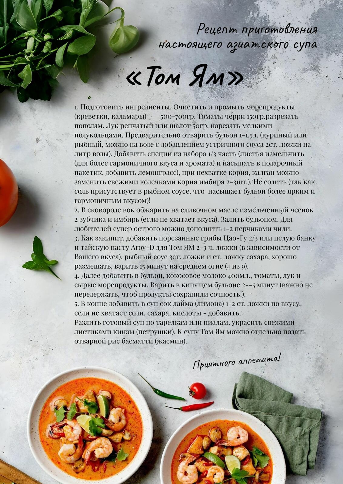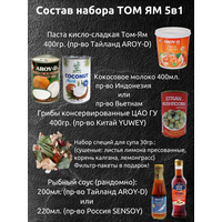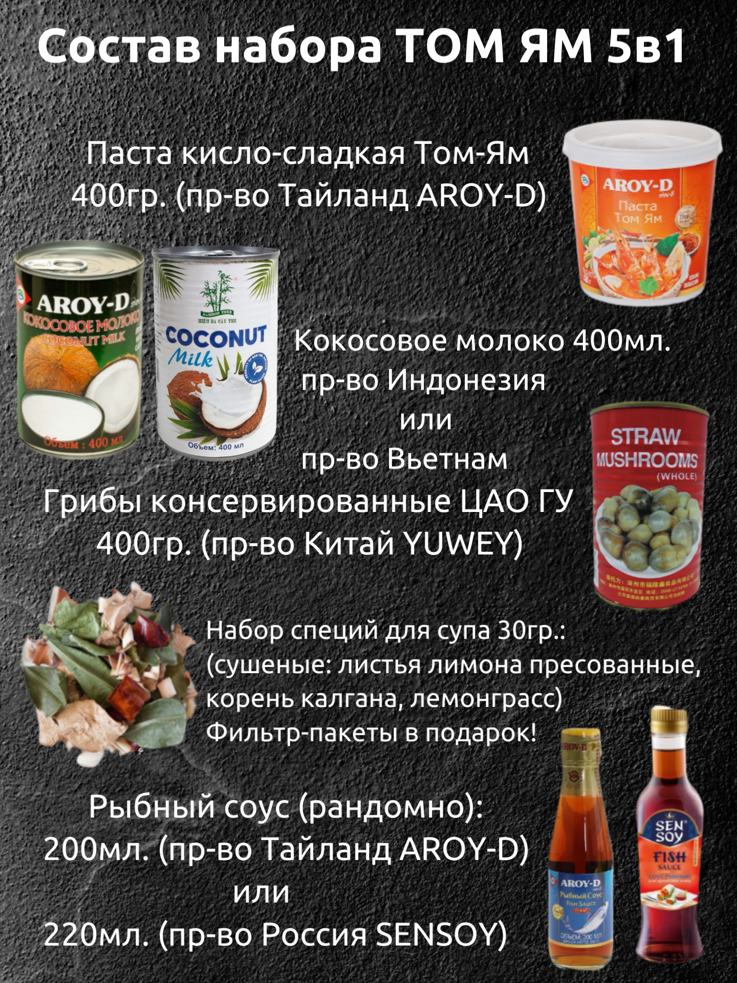 | Состав | Паста "ТОМ ЯМ" (AROY-D, Тайланд), 400гр. (лемонграсс 24%, соевое масло, сахар, лук-шалот, галангал, красный перец чили сушеный, чеснок, мякоть тамаринда, соль, регулятор кислотности лимонная кислота, усилитель вкуса и аромата глутамат натрия, рыбный соус (анчоус, соль, вода), креветочная паста (креветки, соль), каффир-лайм) Кокосовое молоко 17-19% (AROY-D, Индонезия), 400мл. (переработанная мякоть кокосового ореха 70%, вода, эмульгатор Е435 = 0,01%) или (рандомно по наличию) Кокосовое молоко 86% (жирн. 17-19%) BAMBOO TREE 400мл, Вьетнам (переработанная мякоть кокосового ореха 86%, вода, эмульгатор Е435, стабилизатор: Е466) Соус рыбный (AROY-D, Таиланд), 200мл. (экстракт анчоуса 72%, соль, сахар) или (рандомно по наличию) Соус рыбный (SEN SOY, Россия), 220мл. (вода, соль, сахар, концентрат рыбного соуса (рыба, соль, вода), регуляторы кислотности (уксусная кислота, лимонная кислота), ароматизатор и консервант (бензоат натрия)) Специи для супа "Том ЯМ" ~30гр. (листья лимона прессованные, сухие; лемонграсс измельченный, сухой; корень калгана, сухой) Грибы консервированные ЦАО-ГУ для супа "ТОМ ЯМ" (YUWEY, Китай), 400мл. (сух. вес 170гр.) (грибы ЦАО-ГУ, вода, соль, лимонная кислота) |