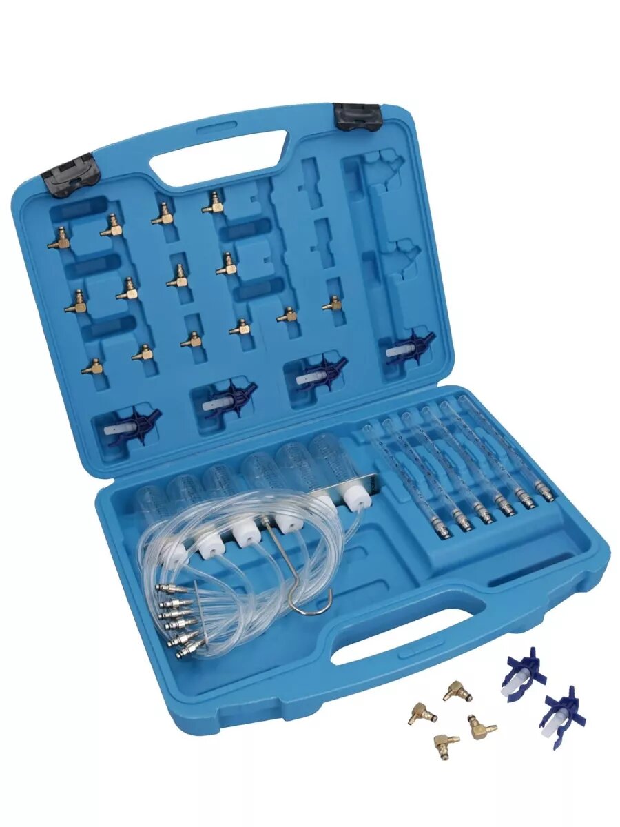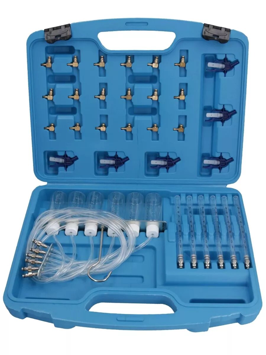 Тестер герметичности дизельных форсунок Common-Rail с адаптерами в пластиковом кейсе от бренда EJC. Прибор предназначен для диагностики форсунок в дизельных двигателях, до 6-цилиндров, снабженных системой подачи топлива Common Rail. Позволяет быстро и легко диагностировать форсунки на основе измерения герметичности топливных форсунок (перетока топлива). Благодаря этому Вы можете легко оценить потенциальный ущерб, загрязнения или утечки форсунок. Этот комплект предназначен для сравнения количества топлива, возвращаемого форсункой в бак. Сравнивая количество топлива в каждом контейнере, можно определить поврежденную форсунку.
