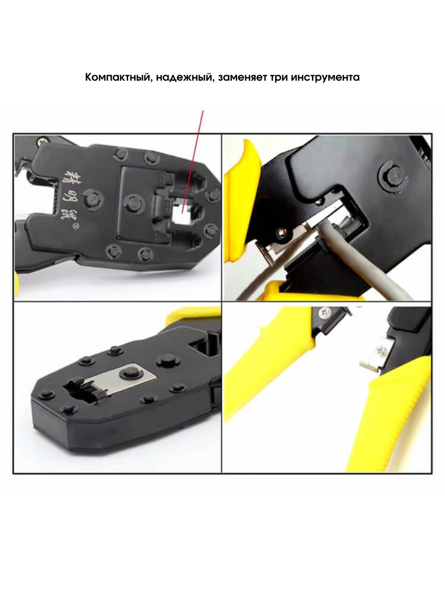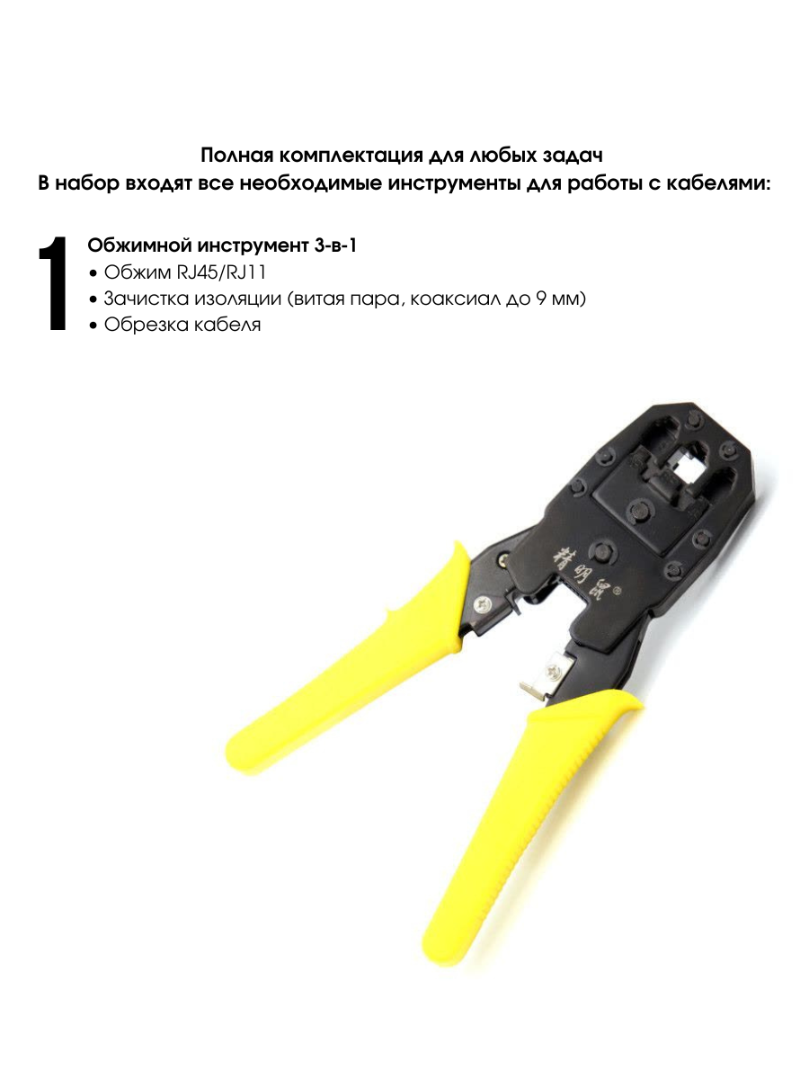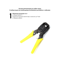 Комплектация кабель-тестер NF-468 - 1 шт обжимной инструмент 3 в 1 - 1 шт длинногубцы - 1 шт плоскогубцы - 1 шт плоская отвертка - 1 шт крестовая отвертка - 1 шт универсальный нож - 1 шт зачистные клещи - 1 шт штекер модуля 8P - 1 набор сумка - 1 шт