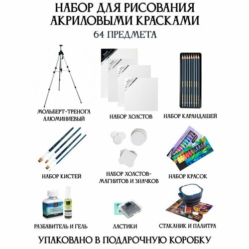Большой подарочный набор для рисования акриловыми красками - идеальный выбор для начинающих и опытных художников, желающих создавать яркие и долговечные произведения искусства. В комплект входят все необходимые материалы и инструменты для творчества, включая высококачественные акриловые краски, кисти различных размеров, палитры для смешивания цветов, холсты, мольберт и многое другое.