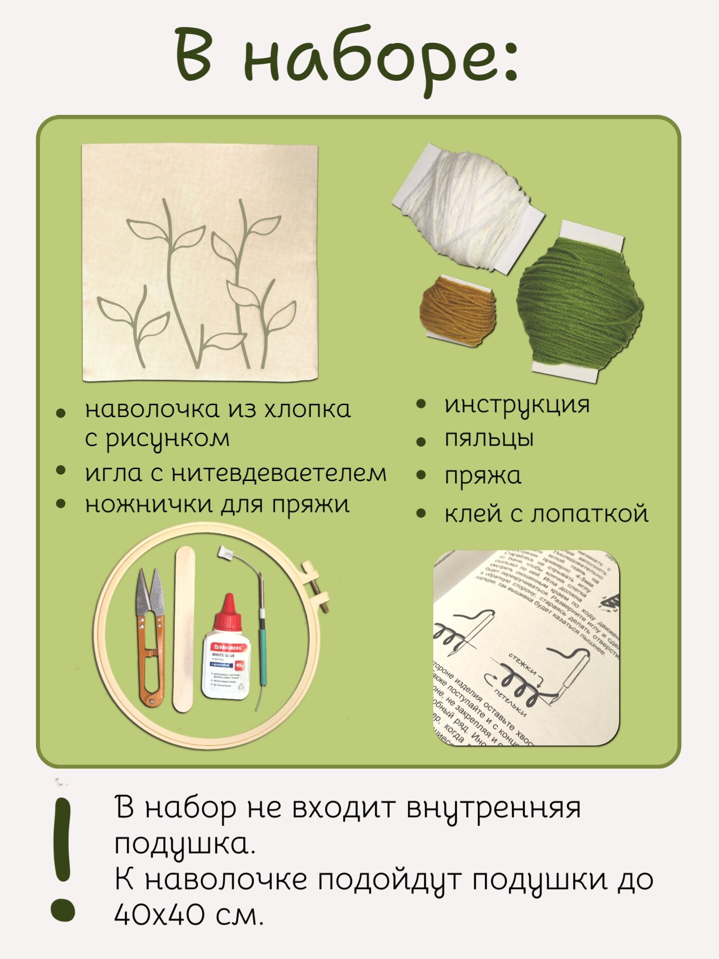 В коробке вы найдете все необходимое для создания красивого и оригинального предмета для дома - наволочки в стиле пинтерест. Трендовый ботанический дизайн с нотками бохо поможет создать настоящее украшение для вашего дома.