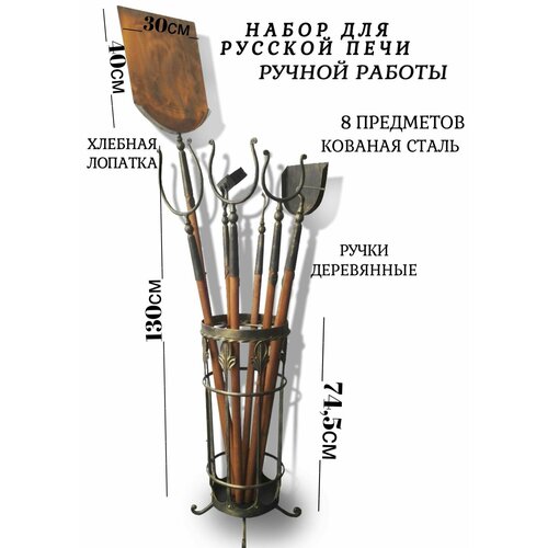 Входит: Хлебная лопата /для пиццы лопата- 1 шт, ухват (рогач) разных размеров, кочерга-1шт, чапельник (сковородник)-1шт, щётка- 1шт, совок для золы-1шт, подставка — корзина для хранения