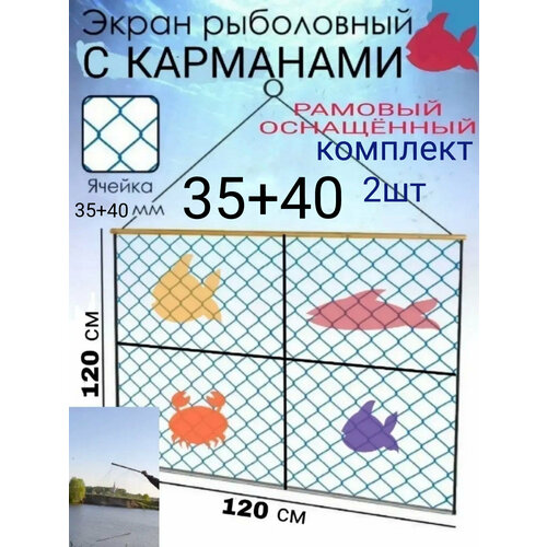 Экран рыболовный с карманами оснащенный. Комплект из 2 экранов с ячейками 35+35, 35+40, 35+22 мм. Российское произвдство, штучное изготовление. Качество несравнимо лучше одноразовых китайских образцов, в большинстве продающихся на рынке. Китайских аналогов экранов с карманами нет. Гораздо более уловист чем экраны без карманов. Рыба вплывает в карман и запутывается как в паутине. Прочная поплавочная рейка без сучков. Для прочности применена сплетёная втрое способом мультимонофил леска 0.12 мм Crayfish. При таком сплетении лески данный экран ремонтопригоден. Размер 1,2х1,2 м. Экран разделён на четыре одинаковых вытянутых кармана 0,6х0,6м. Карман выдерживает нагрузку в 5кг. Ячейка 22х22 мм применима на уклейку, 35х35 и 40х40 мм применима на рыбу размером от ладони. При первом использовании и раскручивании данного экрана, обратите ВНИМАНИЕ как он скручен. Скручивать (складывать) его обратно очень просто и быстро, НО необходимо строго в обратной последовательности.