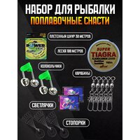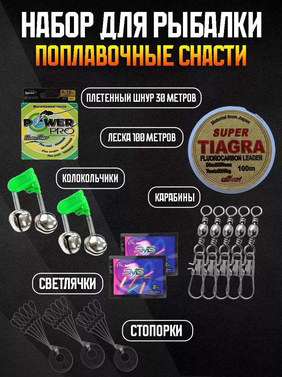 Набор для рыбалки состав: Крючки разных размеров 8 пачек, сигнализаторы поклевки колокольчики - 2 штуки, стопорки для лески, карабины с вертлюгами и светлячки для ночной рыбалки
