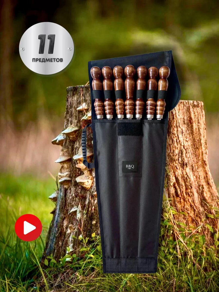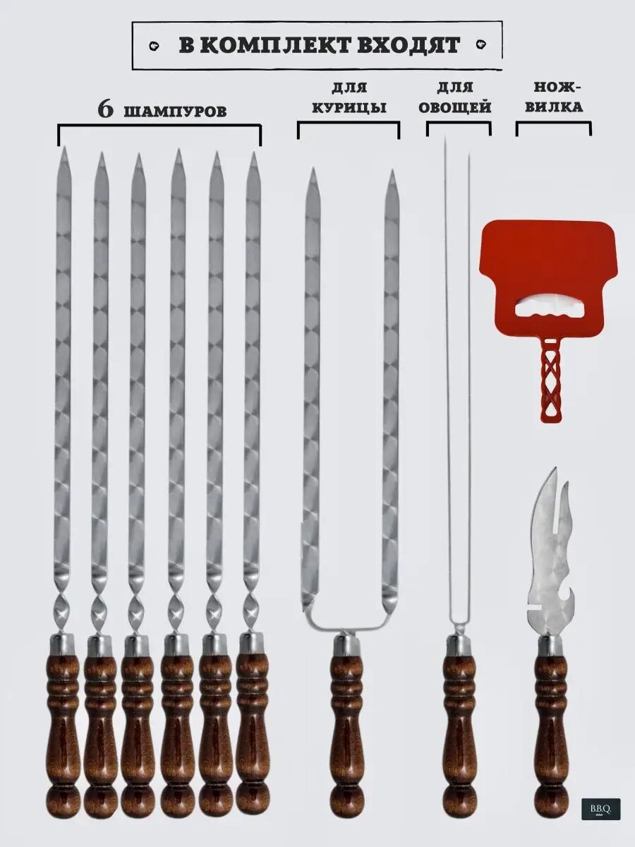 Шампура от производителя в РФ. Наше преимущество - качественное исполнение. Надежное крепление. Использование не токсичного лака. Толстая пищевая нержавеющая сталь. Острое ровное острие. Практичный удобный чехол. Отдых на природе - это прекрасный способ расслабиться и отдохнуть, забыв о домашних делах и заботах. Всем любителям хорошего отдыха понравится этот набор из разных шампуров от компании B.B.Q. Набор шампуров с деревянной ручкой - это отличный подарок для любого мужчины. Всего представлено 5 разных вариантов товара. В зависимости от выбранной модели, в комплект входят от 6 до 12 предметов. Все составляющие шашлычного набора находятся в двустороннем практичном чехле из водоотталкивающей износостойкой ткани. Шампуры производятся из 100% нержавеющей стали марки AISI 430. Она устойчива к нагреванию. Набор подойдет для приготовления на мангале барбекю, стейка, сосисок, люля - кебаб. Этот набор шампуров для шашлыка подарочный можно подарить на 23 февраля на новый год годовщину свадьбы.