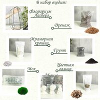 | Комплектация | Флорариум 1 шт. Грунт 1 шт. Дренаж 1 шт. Мраморная крошка 1 шт. Галька 1 шт. Мох 1 шт. Статуэтка 1 шт |