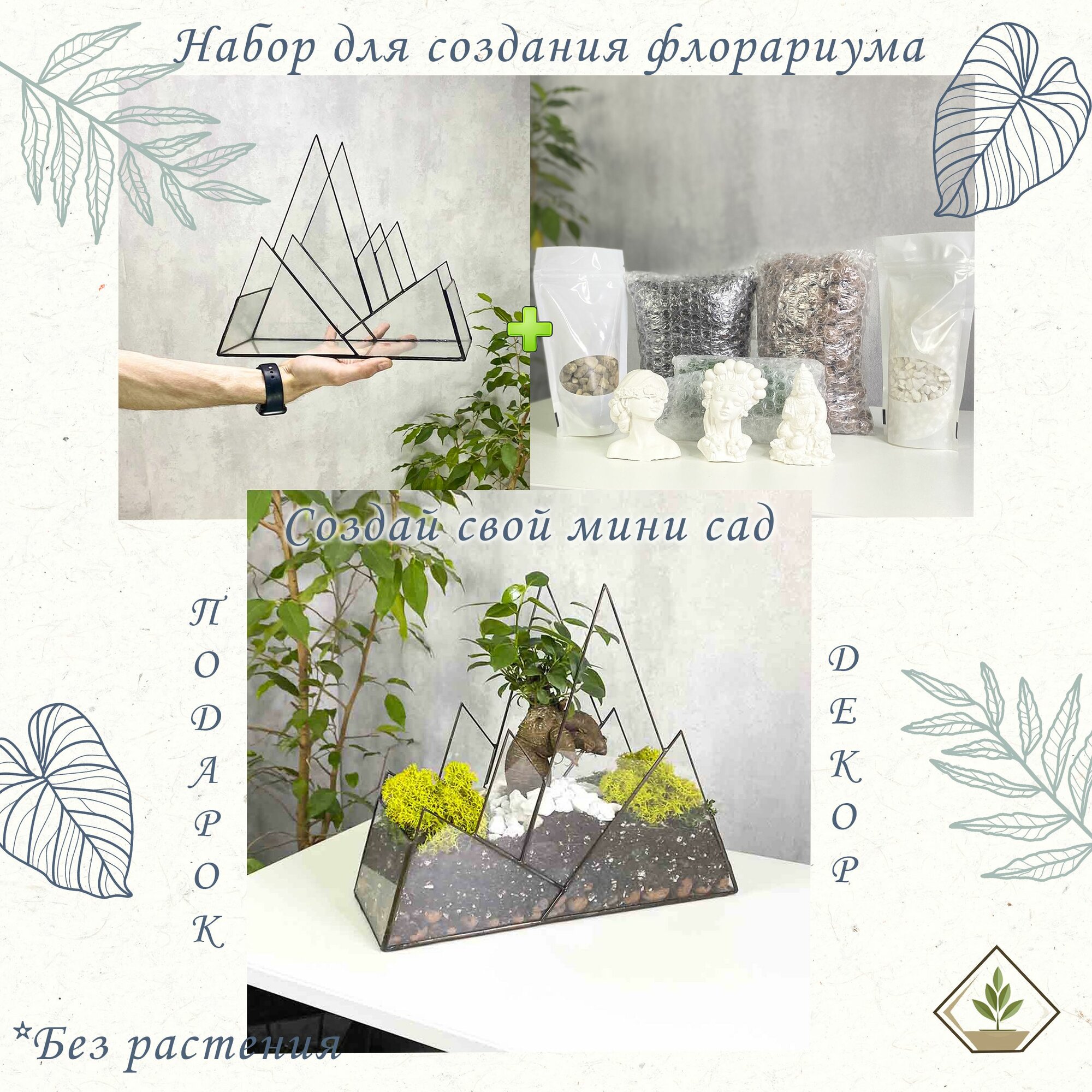 Создайте уникальный флорариум в форме Горы с нашим набором для творчества! Этот стильный комплект идеален для любителей рукоделия и флористики. В него входят все необходимые элементы: прочная стеклянная основа, которая станет отличным кашпо для вашего внутреннего декора, а также различные аксессуары для оформления.