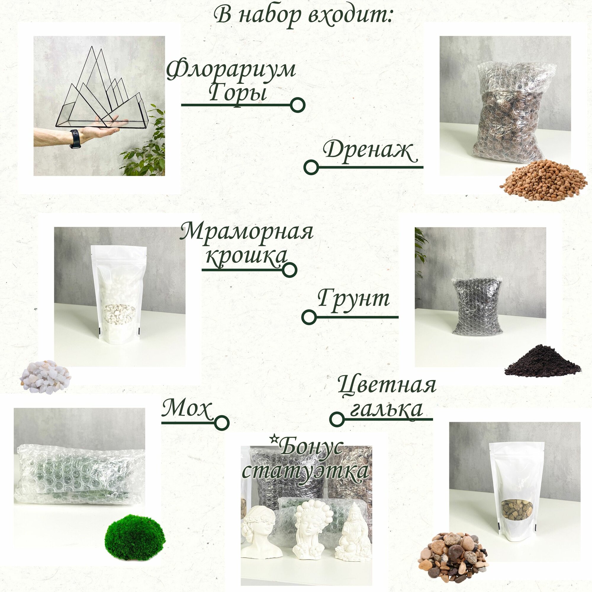 | Комплектация | Флорариум 1 шт. Грунт 1 шт. Дренаж 1 шт. Мраморная крошка 1 шт. Галька 1 шт. Мох 1 шт. Статуэтка 1 шт |