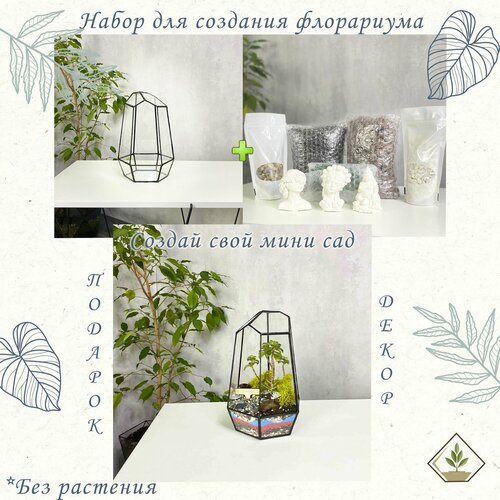 Флористический набор для сборки флорариума своими руками. В комплект входит: Флорариум, дренаж, грунт, украшения, статуэтка, мраморная крошка, мох стабилизированный, галька. Почти каждый цветок будет лучше цвести в флорариуме, чем в классическом кашпо. Какой состав грунта считается "универсальным" для всех растений? В них одинаковое количество микро и макроэлементов. Чаще всего в грунт добавляют: вермикулит, перлит, кора, торф субстрат, агроперлит, почва с органическими отходами. Обычно горшок называют деревянным, глинянным, керамическим и иногда пластиковым контейнером. Но если материал стенок стеклянный, а "швы" спаянные оловом, то есть металлические, то это уже флорариум. Не имеет значение настольный он или напольный, кроме того, что раньше напольный называли "вазон". А сейчас стеклянный, прозрачный, флорариум может стать прекрасным дополнением к вашему интерьеру. Базовые комплектующие для красивой композиции: дренаж, а лучше мрамор (мраморная крошка), или гальку (некоторые используют цветной камушек). Самый дешевый дренаж - керамзит, а самый красивый - мраморная крошка. Далее сверху посыпают грунт (землю), можно поиграться с цветным песком, но это не совсем подходит современному интерьеру. Сажают растение, украшают мхом. Натуральный или стабилизированный, выбор только за вами. Единственное, что стоит учесть, это то, что стабилизированный мох красится и может окрасить мраморную крошку. Какое растение обычно используют для посадки в стеклянный мини-сад: гортензия, орхидея, суккулент, антуриум, замиокулькас, кактус, фикус, сирень, спатифиллум, бонсай, фикус бенджамина, сансевиерия, драцена, юкка. Лучше сажать многолетнее растение, так цветение и запах будут радовать вас больше и дольше!