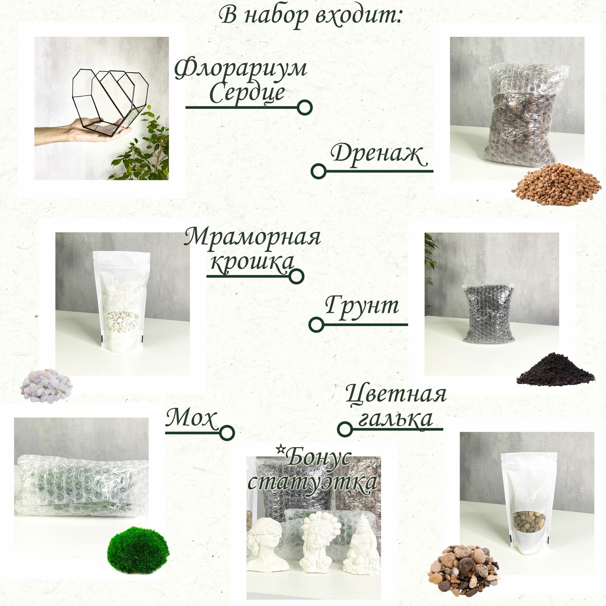 | Комплектация | Флорариум 1 шт. Грунт 1 шт. Дренаж 1 шт. Мраморная крошка 1 шт. Галька 1 шт. Мох 1 шт. Статуэтка 1 шт |