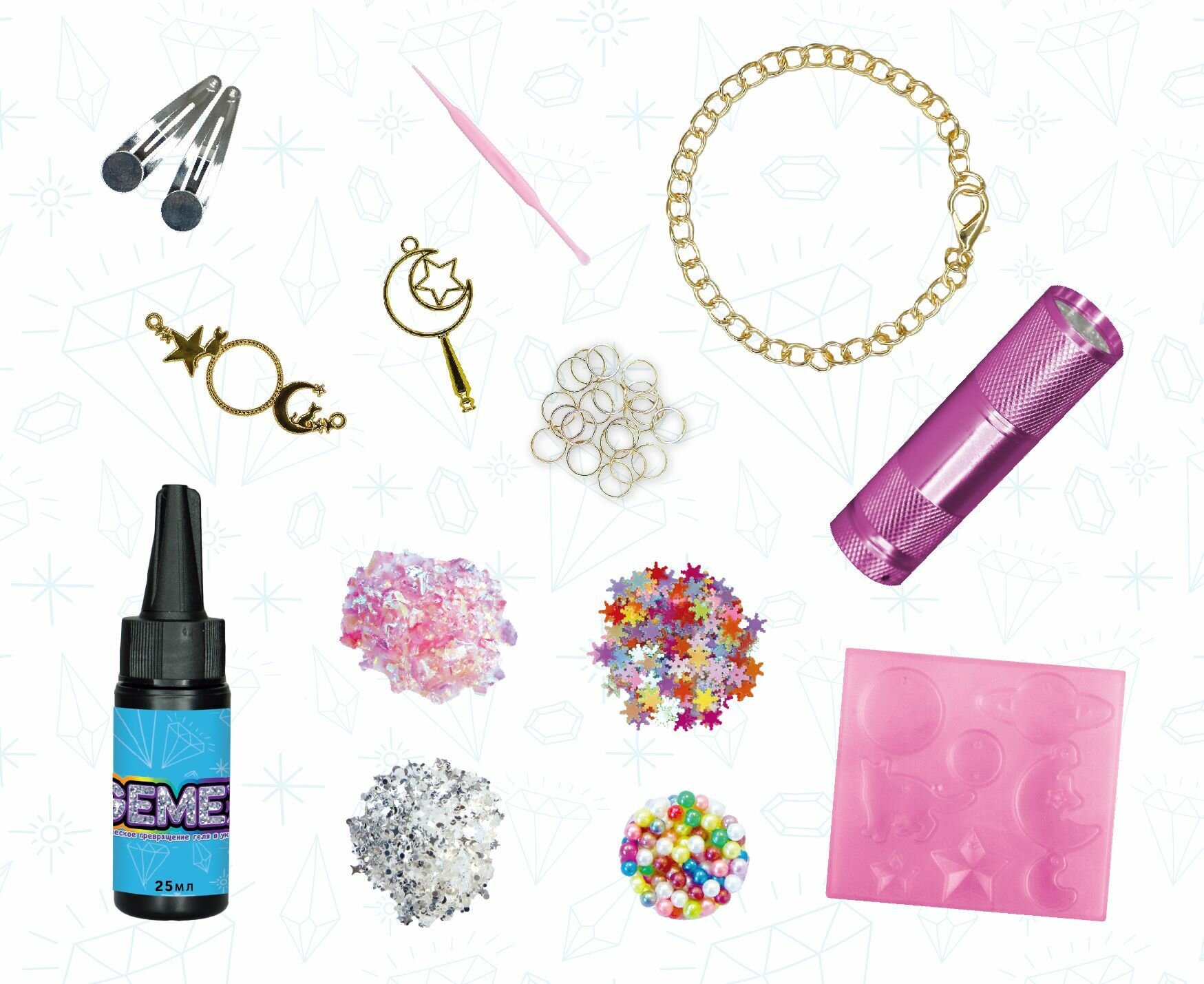 В состав набора входит все необходимое для создания стильных и оригинальных изделий. УФ лампа-ракушка со световыми и звуковыми эффектами позволит вашим украшениям засиять ярче и привлечь внимание окружающих.