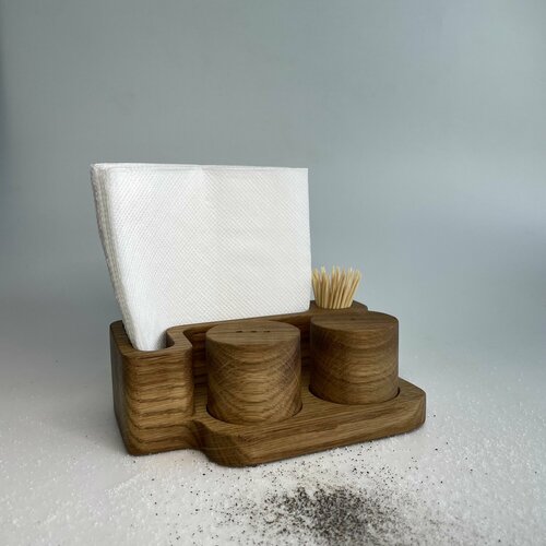 В этом наборе есть всё, что необходимо: отсек под зубочистки, под салфетки, 2 «бочонка» под специи, сама подставка, на которой всё это смотрится компактно и аккуратно.