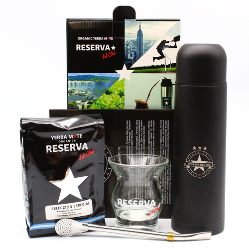 мате Reserva Del Che 250г, фирменный стеклянный калабас Reserva Del Che, бомбилья из нержавеющей стали, алюминиевый термос для воды Reserva Del Che 0,5 л