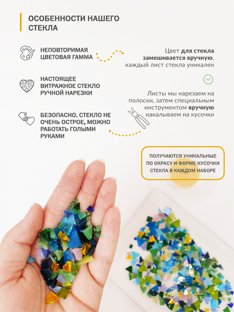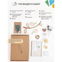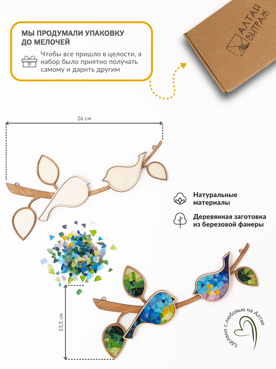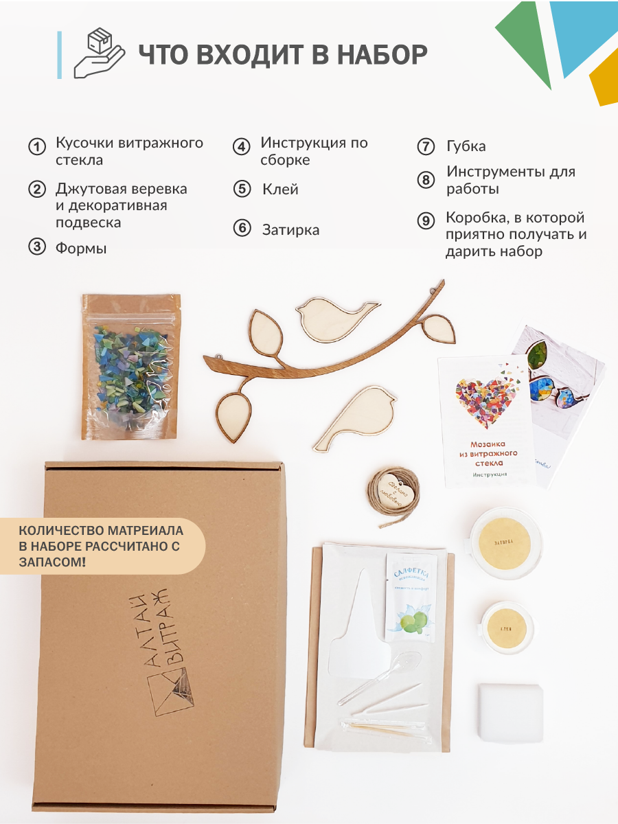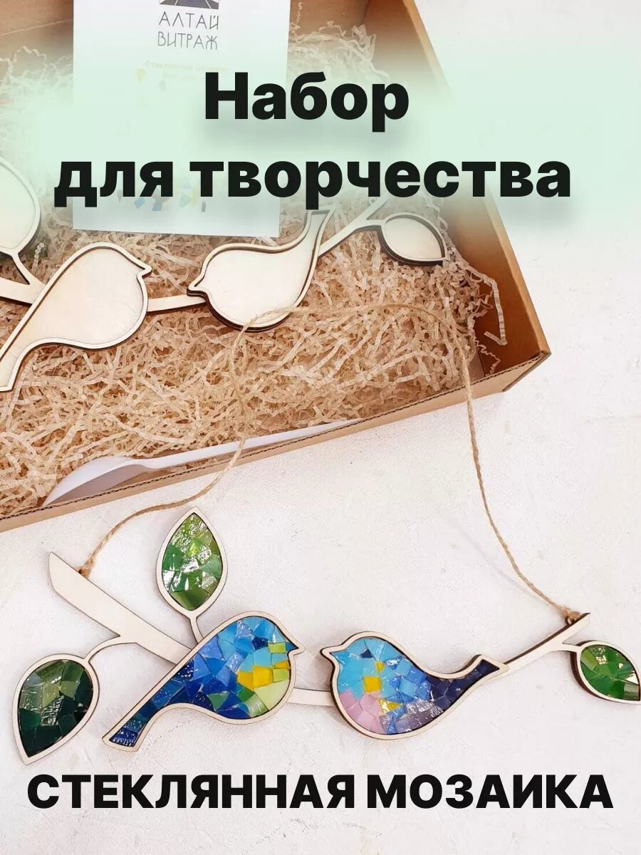 Набор стеклянной мозаики для домашнего творчества - идеальный выбор для тех, кто хочет попробовать себя в искусстве и создать уникальные аппликации. Наш подарочный набор включает в себя все необходимые инструменты и материалы, чтобы вы могли создать свой шедевр. Благодаря простоте и удобству использования, даже начинающие художники смогут с лёгкостью создать красивое и яркое изделие. Вы сможете украсить интерьер, создать подарок для близких и друзей. Натуральная крафтовая упаковка, деревянная форма, кусочки волшебного стекла создают особое настроение для творческого процесса. Каждое изделие получится уникальным, так как набор содержит кусочки стекла разных форм и размеров. Размер ветки - 26х14 см, птички - 10х4,5 см. На фото показан пример собранной мозаики, в комплект не входит. 1. Деревянная форма; 2. Разноцветные кусочки стекла; 3. Клей; 4. Затирка для швов; 5. Ложка; 6. Губка; 7. Джутовая верёвка; 8. Инструкция.