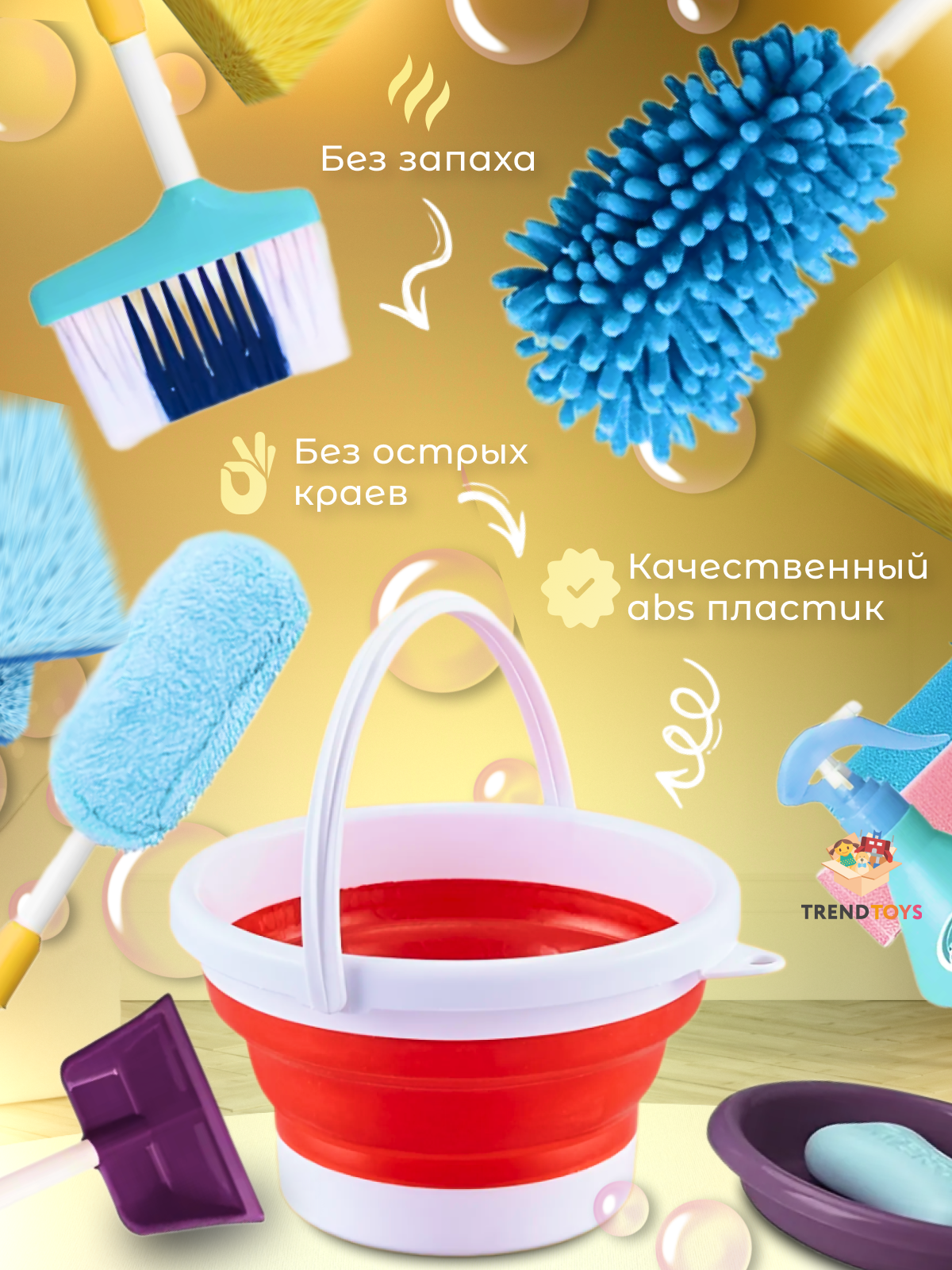 ведро, пакетик с имитацией мусора, принадлежности для уборки, пылесос, совок, тазик, швабра, щетка