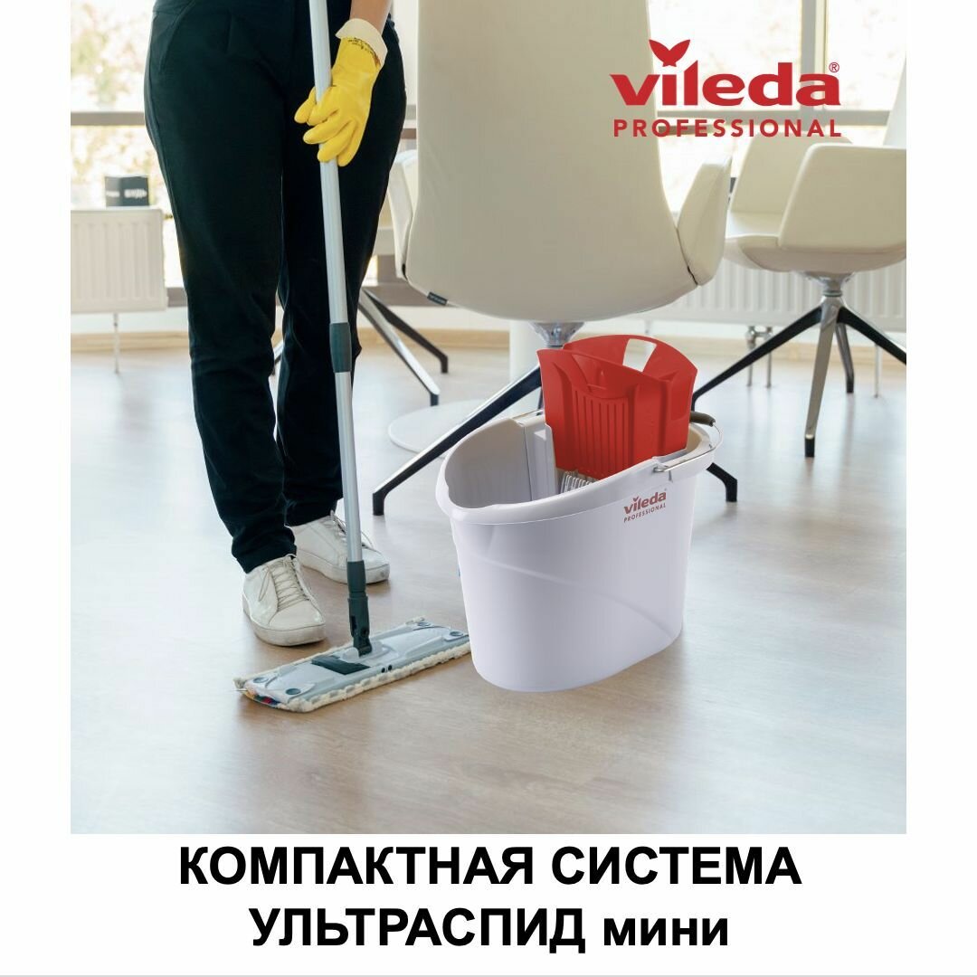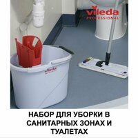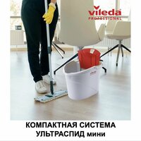 Компактная система для уборки Ультра Спид мини Vileda Professional. Набор изготовлен из высококачественных износостойких материалов для уборки полов в небольших помещениях площадью до 75 м2. Данный набор исполнен в красном цвете (цветовая кодировка) и создан специально для уборки туалетных комнат и санитарных зон.