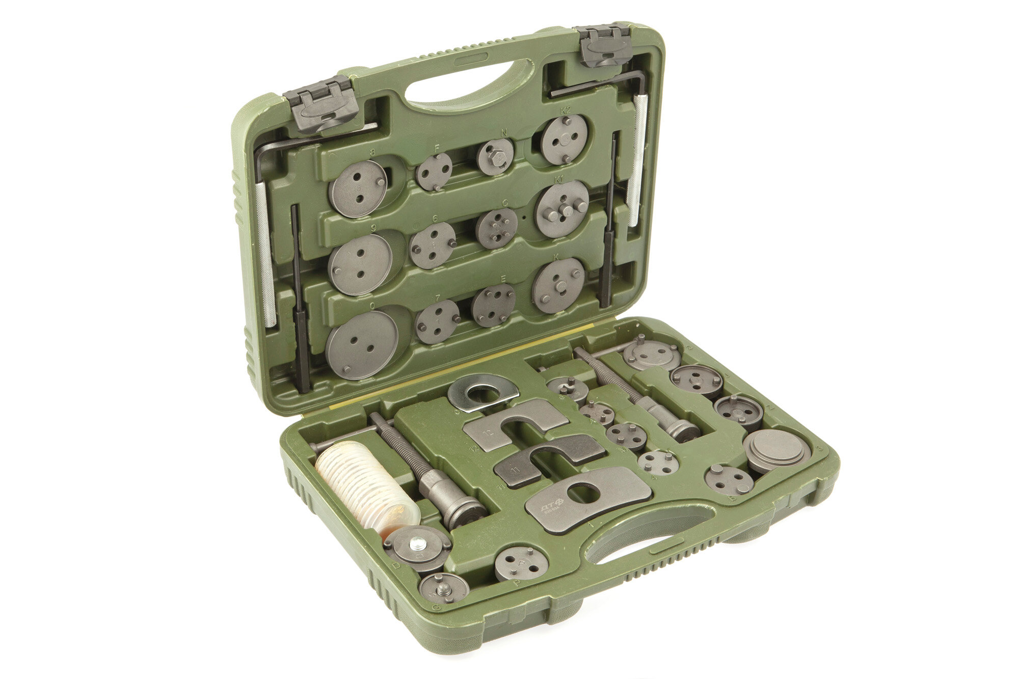 Состав набора: – Т-образная рукоятка с левой и правой резьбой - 2 шт; – Насадка для утапливания поршней без вращения - 1 шт; – Насадка-адаптер под вороток 3/8’’, для совмещения пазов на поршне и тормозных накладках - 1 шт; – Ключ L-образный шестигранный 6, 7 мм - 2 шт; – Планка-упор - 4 шт; – Насадки - 22 шт; – Выколотка 3, 5 мм - 2 шт; – Смазка - 1 шт.