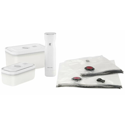 Стеклянный стартовый вакуумный набор размеров FRESH & SAVE, особенно подходит тем, кто старается сделать мир немного лучше. Суперпрактично: поместите лазанью, салат или вкусные закуски с вечеринки в контейнеры из набора и откачайте воздух. В элегантных пластиковых боксах и универсальных пакетах еда остается свежей до пяти раз дольше, чем при хранении без функции вакуума. Благодаря удобному беспроводному вакуумному насосу, входящему в комплект, герметичное хранение всех важных продуктов без потери запаха становится детской забавой. Удобное устройство автоматически останавливает процесс, как только создается достаточный вакуум. Помимо насоса, в комплект входят два размера вакуумных пакетов - S и M (нельзя мыть в посудомойке), а также два пластиковых бокса, которые можно мыть в посудомоечной машине, емкостью 0,4 и 1,1 литра соответственно.