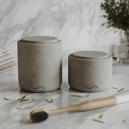 Набор декоративных аксессуаров для ванной состоит из 2-х предметов: банки Astrid S и Astrid XS. Все изделия изготовлены вручную из особо прочного архитектурного бетона и обработаны матовым лаком, надёжно защищающим поверхности от воды и появления разводов. К каждому изделию в наборе прилагаются самоклеящиеся фетровые и силиконовые накладки. В комплект входят: Банка Astrid S 0,27 л | 10x9 см | 1 шт. Банка Astrid XS 0,18 л | 7x9 см | 1 шт. Набор для ванной комнаты отлично подойдет в качестве подарка. Лаконичный дизайн бетонных изделий позволяет им идеально вписаться в любой интерьер. Декоративные изделия из бетона - это стиль, качество и невероятная долговечность. При аккуратном обращении изделие будет служить десятилетиями, со временем становясь только крепче. Мы влюблены в наш продукт. Каждое изделие появляется в нашем ассортименте не случайно и продумывается до мелочей, внимание к которым и создает разницу между шедевром и очередным бездушным предметом. Бетон был выбран нами не случайно. Этот потрясающий натуральный материал способен принимать любую форму и, благодаря особенностям производства, каждая новая партия имеет собственный уникальный оттенок, фактуру, структуру пор и характер. Создавайте свой неповторимый интерьер и атмосферу с предметами от MUSKO HOME.