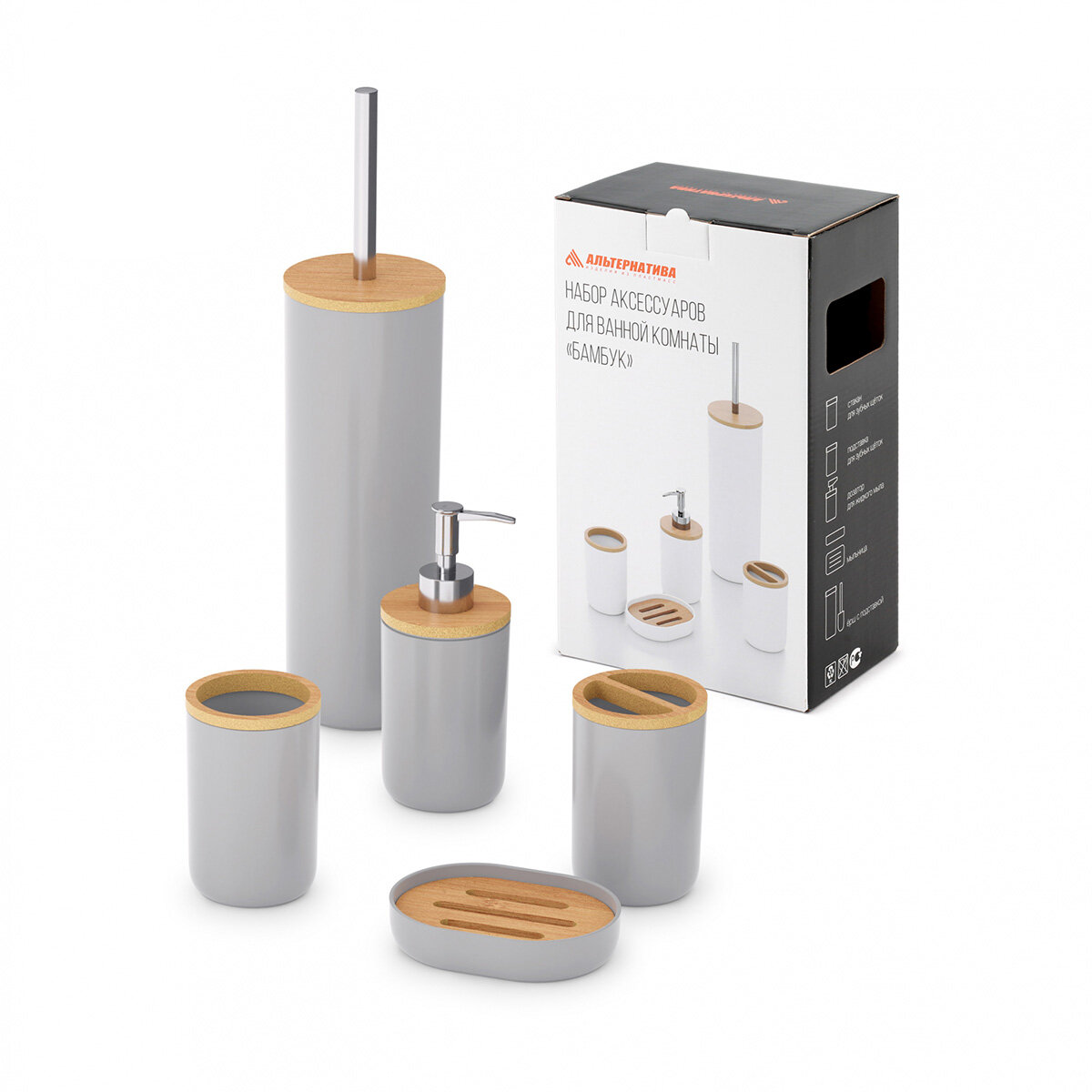 Купить Набор аксессуаров для ванной комнаты Альтернатива Бамбук, 5 предметов, серый с доставкой по всей России.