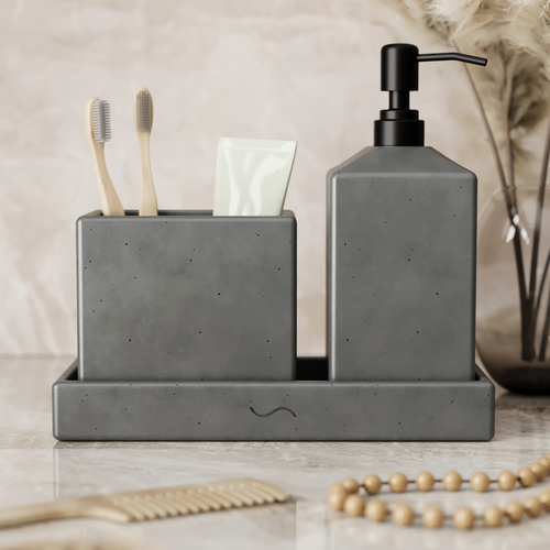 Набор для ванной Emily 11 (дозатор с черной помпой, стакан двойной, поднос S), бетон, графитовый глянцевый: сравнение цен, характеристики, фото, актуальное наличие и цены.