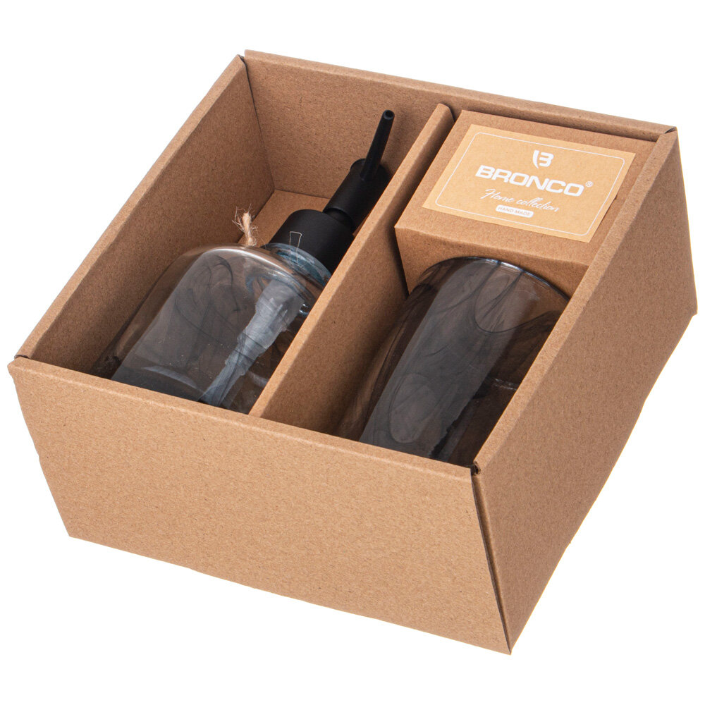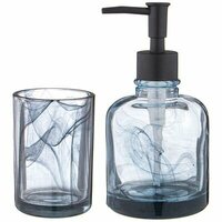 В набор входят дозатор для жидкого мыла и стакан-подставка для зубных щеток. Оба предмета выполнены в стильной фигурной форме и имеют практичный серый и черный цвет.